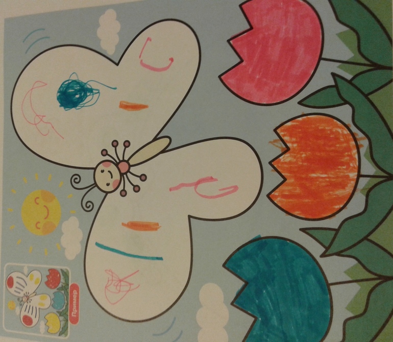 Вот так мы красили бабочку. И оранжевый цветок Саша сама закрасила. Остальные я