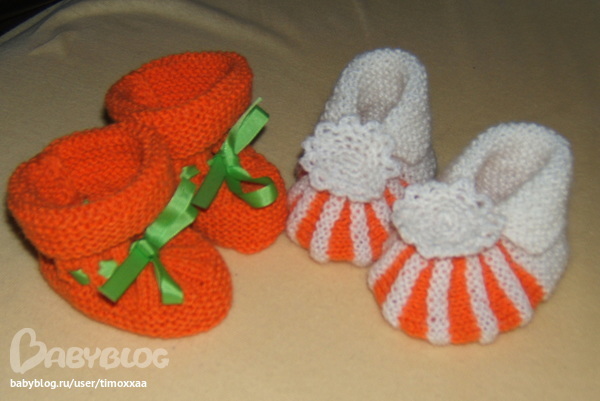 Моя первая беременность))Полистала тут недавно странички по вязанию в интернете и загорелось мне связать что-нибудь для моего малышка. Так как не вязала уже года 2, решили начать с самого простого - с пинеток. Никогда раньше их не вязала. Это оказывается так легко и быстро)) У меня ушло 2 дня, но можно было управиться и за один. Вот представляю вам то, что у меня получилось: