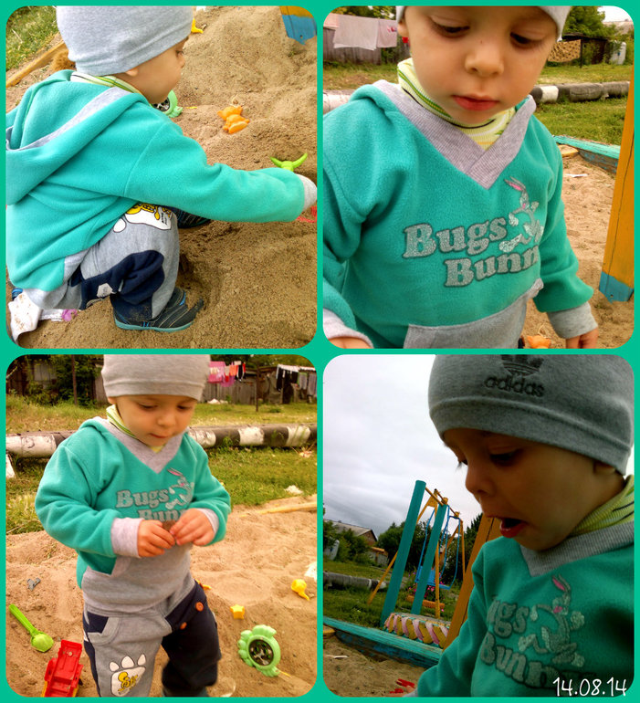 Гуляли в песочке с сынулей. Там скучно, из-за погоды никого нет...