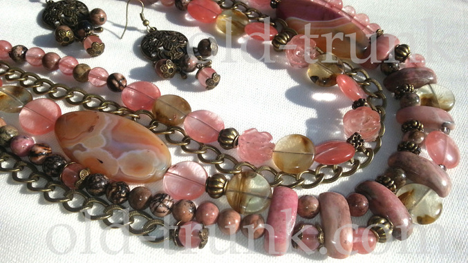 Выполнен из бысин турмалина (большие таблетки), халцедона(гладкий шар, резная роза), родонита (гладкий шар, зубья), крупных овальныхагатов ( с обеих сторон рисунок разный) и металла.