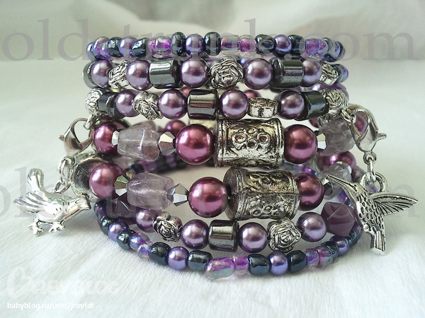 Браслет на основе мемори проволоки, выполнен из бусин аметиста, кошачьего глаза, гематита, стекла, акрила, бисера, металла.