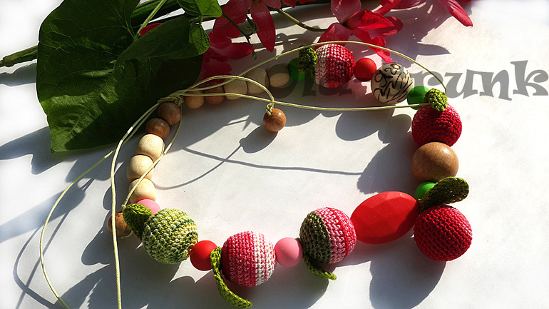 Бусы выполнены из деревянных, можжевеловых бусин, обвязанных хлопком с добавлением ярких бусин из жевательного силикона для прорезывателей зубов, рисунки - пирография, безапасны для детей, не краска.