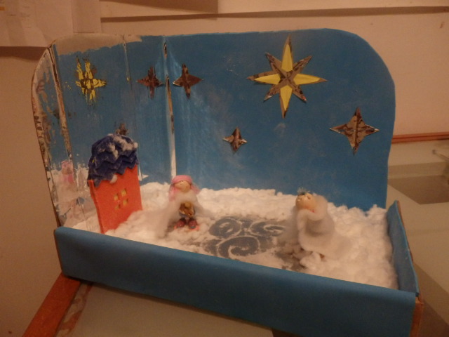 Очень напоминает прошлогоднюю) + ещё сваляла снеговика из шерсти (с метлой), но остальное делали вместе)... фигурки покупные (только накидки сами закрепили)... снег из памперса на ПВА, дом из фетра... каток из бумаги типа фольги...