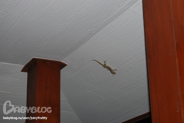 А вот такие гости порой встречаются у нас прямо под крышей, длина этого красавца от носа до хвоста около 25-30 см, чтобы было понятно ) Вообще ночью иногда бывает жутковато от обилия звуков джунглей, сложно даже понять, кто эти звуки издает - то ли птицы, то ли ящерицы, то ли жабы какие-то, а может обезьяны вообще.