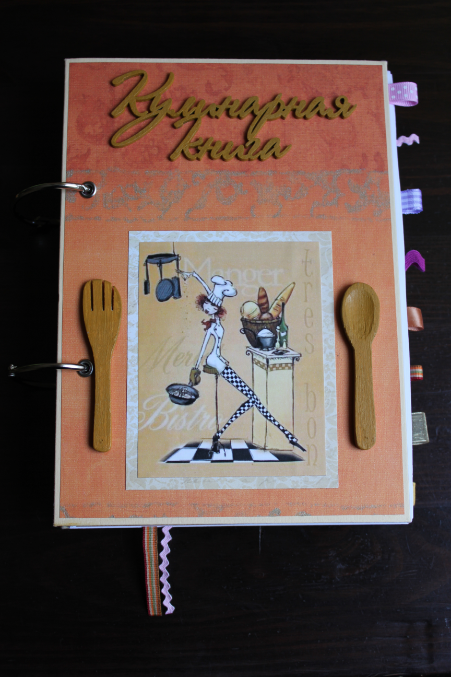 Кулинарная книга сделана в цветовой гамме кухни сесты мужа плюс к этому ей нравятся различные поварята. Обсуждалось абсолютно все. Почти на заказ. Девочки!!! Это оказывается трудно!!! Кулинарная книга была дополнением к основному подарку на ДР. Вроде все понравилось, но не мне. Косяков тьма! Как-то не совсем гладко шел процесс ее изготовления. Кучу материала попортила, обложку переделывала. Опыта набираюсь по-маленьку. И что это я о себе?!