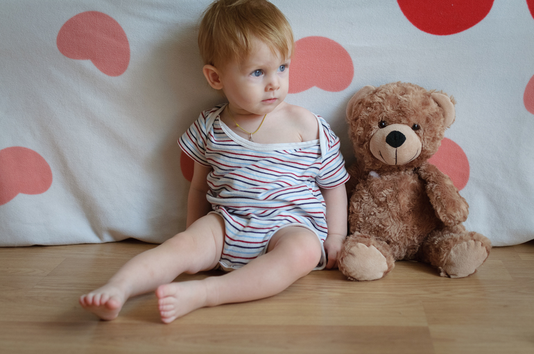 Ужасно любит кота, обнимает его, целует, гладит, ну и стучит по нему иногда, за что получает царапками и очень расстраивается. Засыпает качаясь в кроватке или коляске, ну или под грудью (только вечером и то не всегда). Ночью просыпается несколько раз, утром часто просыпается и требует молоко, стягивает с меня майку (и днем и ночью, днем почти постоянно). Лезут жевательные зубы. Всего сейчас 8 зубов и кусочек 9 торчит.