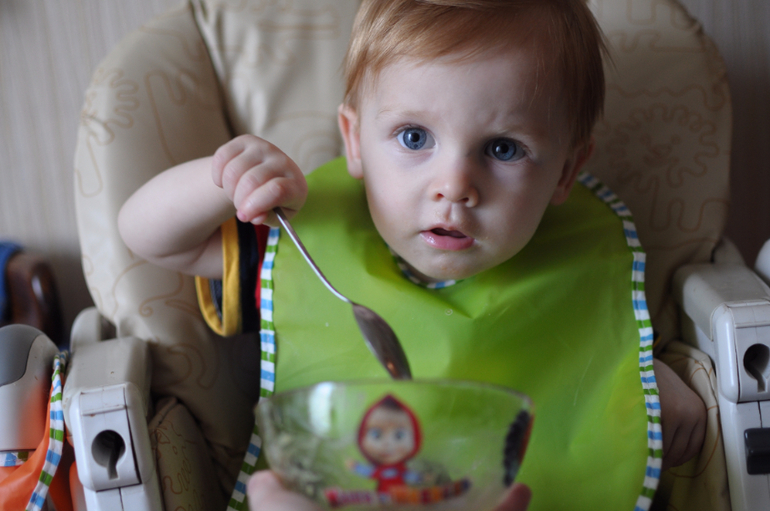 Когда хочет кушать несет нагрудник и пытается залезть на свой стул и причмокивает по дороге. Обожает играть с водой в ванной, бежит туда при одном упоминании о мытье, ну и естественно обожает купаться.
