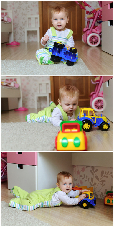 Тёмка активничает, ползает в основном по пластунски, но иногда и нормально может немого проползти, садится с четверенек, научился плюхаться на попу из положения стоя. Ходит вдоль дивана, кроватки, когда стоит держится одной рукой, наклоняется за игрушкой. У всех нижних ящиков открутили ручки (опять), Тема не оставил нам выбора, они его как магнитом притягивают)) Открывает ящик, хватается другой рукой за верх ящика и тут же закрывает его.. вместе с пальцами.. Любимое место у Темы это Ксюшина комната, там столько всего интересного, там вообще все интересно. Особенно машины! Они Темке очень нравятся.. все))