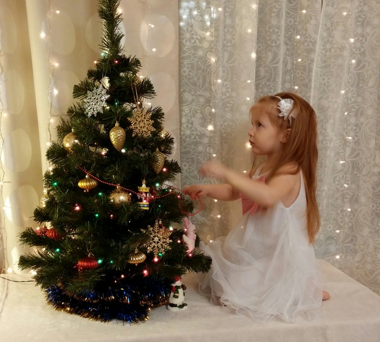 Точнее Ксюша нарядила, я только чуть-чуть подкорректировала, елочка-то мааасенькая))) Мечтаю о большой, но пока не получается ее купить, радуемся той, что есть :)