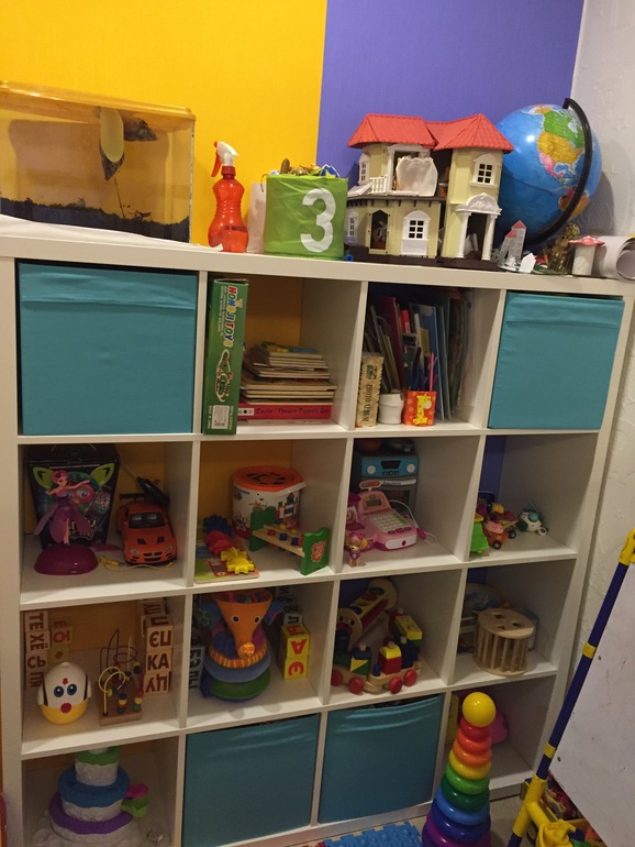 Первым делом занялась организацией хранения игрушек. Хотелось , чтобы они не лежали в одной куче, а были расставлены по полочкам, потому что в первом случае ребёнок просто либо вываливает всё либо проходит мимо, не зная, чем себя занять. Вот что у нас получилось)