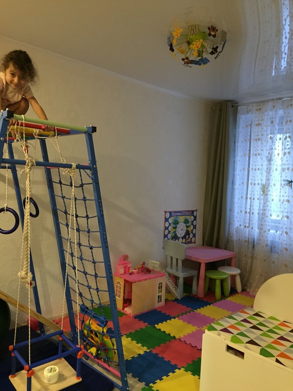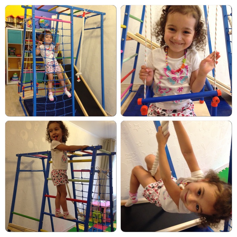 Так, место для игрушек, творчества, сна были сделаны. Дочка очень любит лазить, поэтому и спортуголок хотелось. Долго металась в выборе, остановились на спорткомплексе теремок