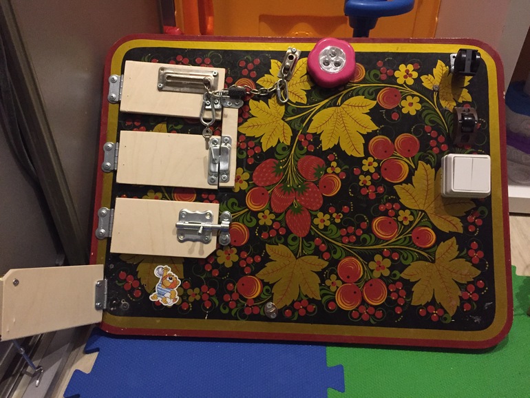 Вот такая развивающая доска- бизиборд. Это, пожалуй, самая лучшая игрушка. Причём на любой возраст. И дочка (скоро 5 лет) сидит и сынок (скоро годик) ковыряется. Она ещё в процессе изготовления, детали докупаются и постепенно прикручиваются. Потом выложу фото готового.
