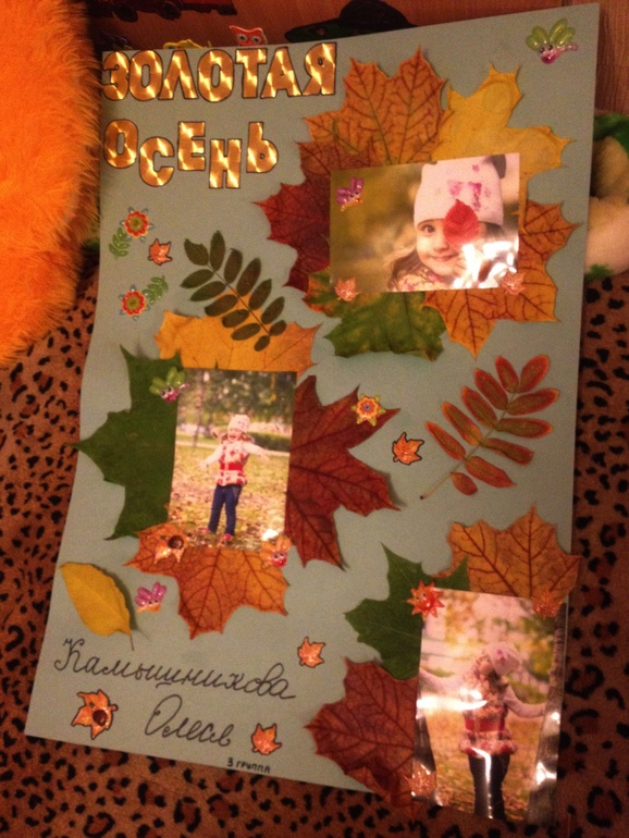 Мы вот такую штуку соорудили с мужем (Олеся, естественно, принимала главнейшее участие =) собирала листья в парке (листья настоящие, проглаженные и высушенные), обводила золотые буковки по трафарету (это самоклеющаяся есть такое слово? я его правильно пишу? бумага), ну и позировала для фотографий.