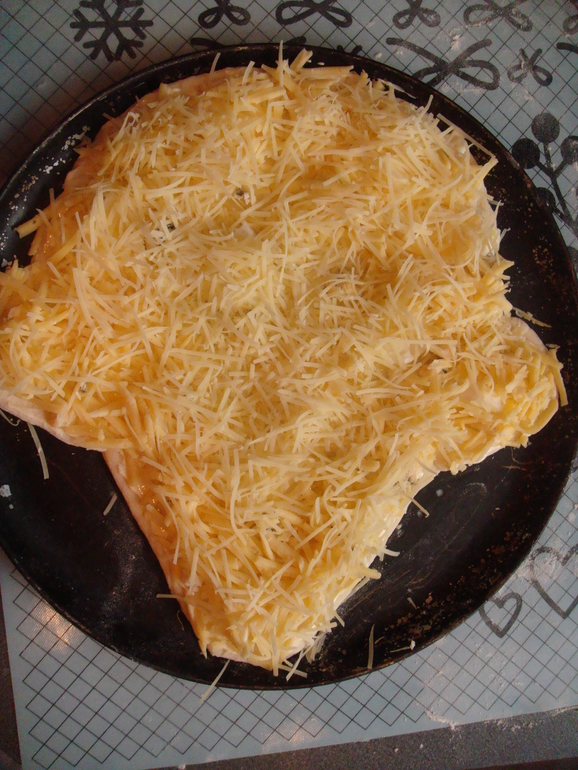 Смазать сырным соусом, разложить сыр (у нас 4 сыра - пармезан, Моцарелла, Горгонзолла, чеддер):
