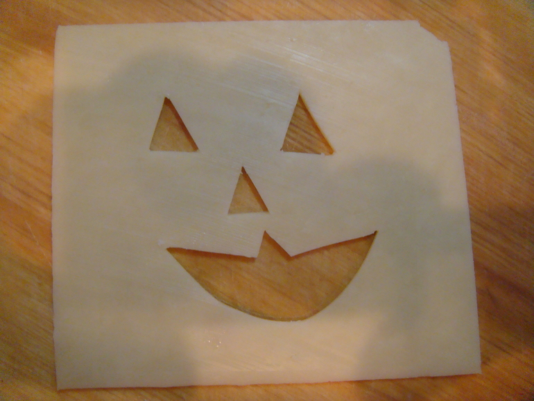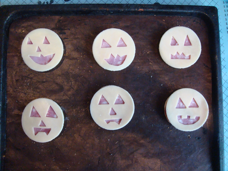 Сверху кружок колбасы. И из ломтиков сыра повырезать "голову Джека":