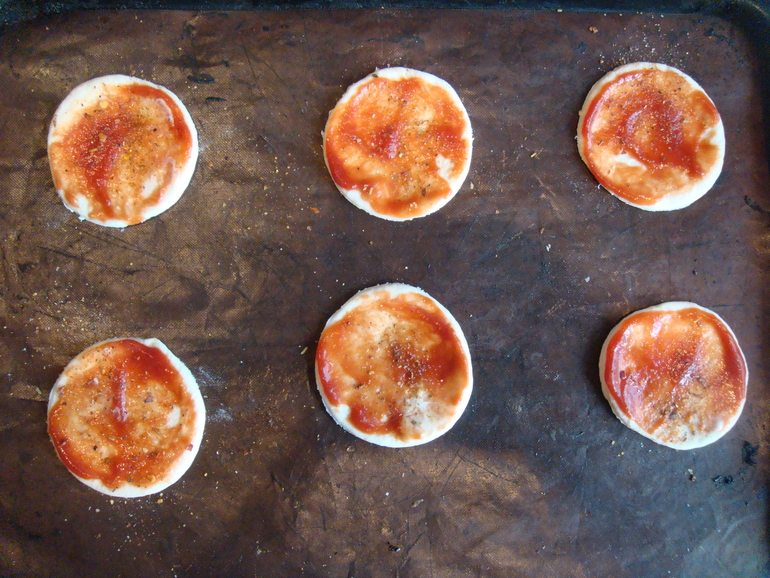 Пекли мы еще и маленькие пиццочки из этого же теста. Разложить кружки на противень, смазать соусом, посыпать приправой для пиццы: