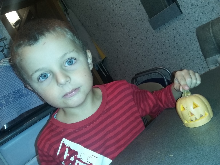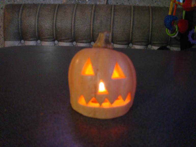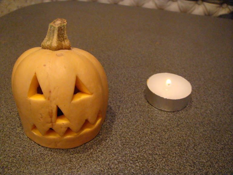 Ну, и не могли мы обойтись без светильника из тыквы. Правда, воспользовались тонкой частью бутылочной тыквы. Вынули сердцевинку, вырезали глаза, нос и рот: