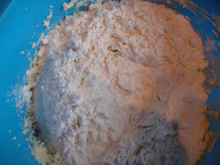 Всыпать щепотку соли, ванилин, 3 стакана муки и 1 ч.л. разрыхлителя: