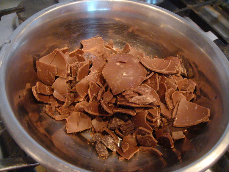 Растопить на водяной бане 100 г шоколада (у нас скорлупки от киндеров):
