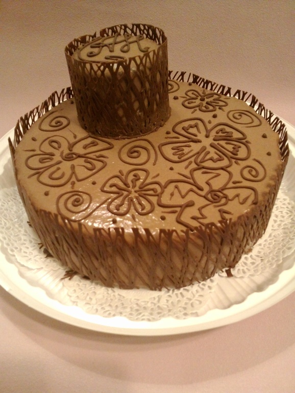 Ну вот, собственно, и основной торт, о котором я упоминала здесь. Состав тот же самый: шифоновый шоколадный бисквит, шоколадный хрустящий слой, шоколадный мусс. Украшен шоколадом.