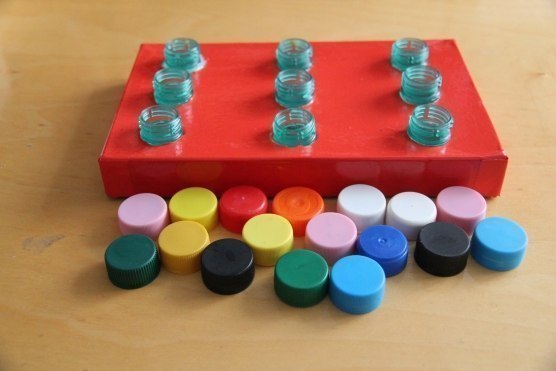 6. Откручивание и закручивание крышек. Потребуются горлышки и крышки от пластиковых бутылок, коробка из-под обуви, клей.
