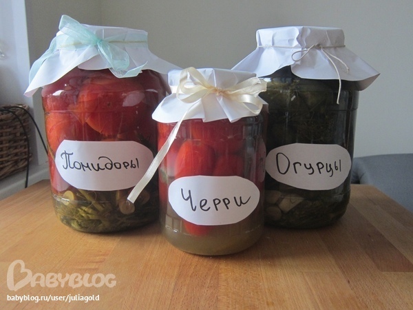 Всегда тайно мечтала заготовить на зиму соленья, но казалось эта мечта так и останется мечтой. Времени не было, а стерилизация, машинки для закрутки откровенно говоря меня просто пугали. И вот родился Никуся и свободного времени стало до фигища :)) и Юль Иванна задалась вопросом как сделать соленья быстро, просто и вкусно... девочки с бб быстро меня соорентировали (читаем мой пост на эту тему) и мы с Ники мчались в направлении рынка за банками и овощами... Результат вы видите :) Стояли банки так, для красоты, и несколько дней назад я решилась попробовать.... Черри скисли :( а остальные просто фантастика! Ура!!!! :)