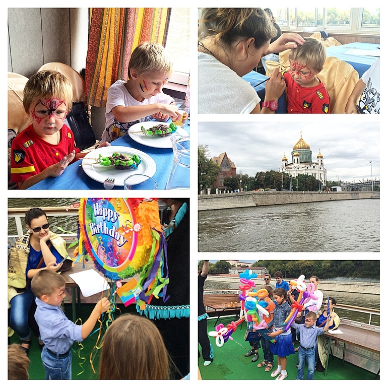 В течение трехчасовой поездки, дети играли с аниматорами, участвовали в конкурсах, танцевали, художник делала им аквагрим, угощались всякими вкусностями (на теплоходе уютный ресторан с детским меню), потом наш именнинник в присутствии всех детей добывал угощения из пиньяты (тянул за ленточки, и в какой-то момент одна из лент расклыла шар и из него посыпались конфеты и конфетти), которыми потом поделились со всеми детьми, даллее аниматоры вручали подарки именинникам: букеты из шаров и открытки и другую приятную мелочь.