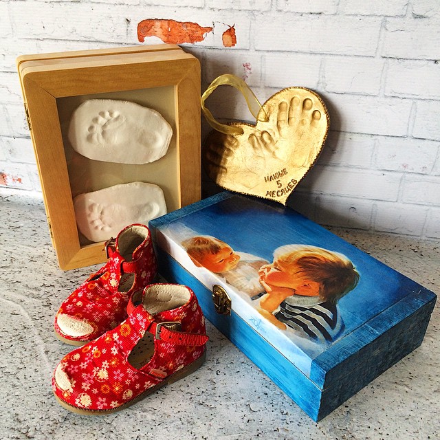 я со старшим о таком не знала, с Кириллом сделала слепки и с Катей, но почему-то по одному... Тоже приятно их держать. Еще бирочки из роддома и снимки с узи)