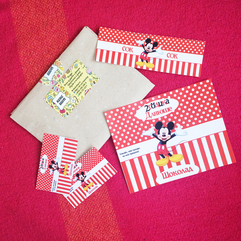Мы привезли и собрали для праздника стол, прикрепили к нему задник с постером 100х100см, который нарисовали сами, шили скатерть с юбкой, делали гигантскую цифту из картона и таблички с надписями, фоторамки с изображениями, а также всю полиграфию: топперы в кексы, наклейки, приглашения, этикетки на бутылочки: