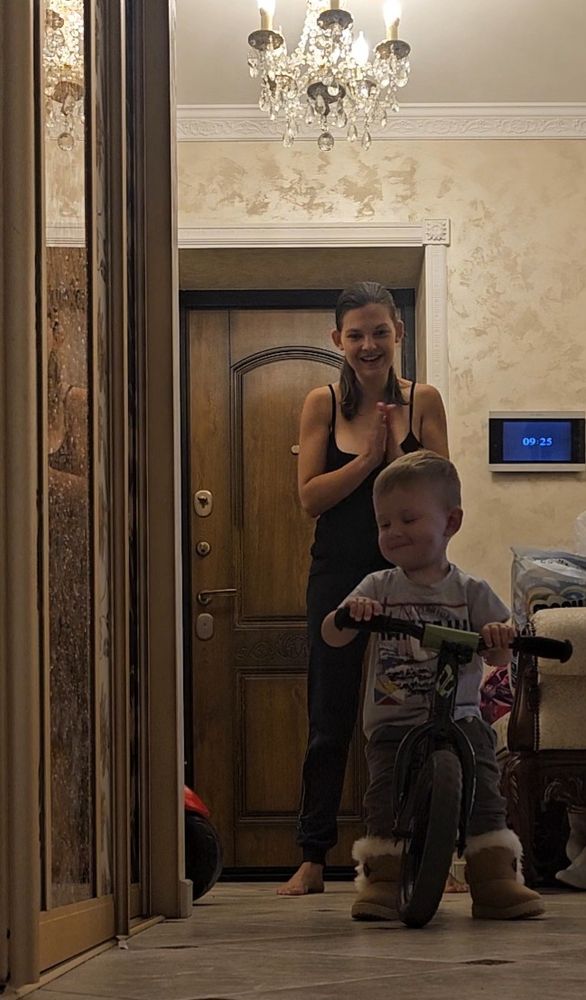 Встал самостоятельно без моей помощи в процессе езды. Пока балансу только учится.