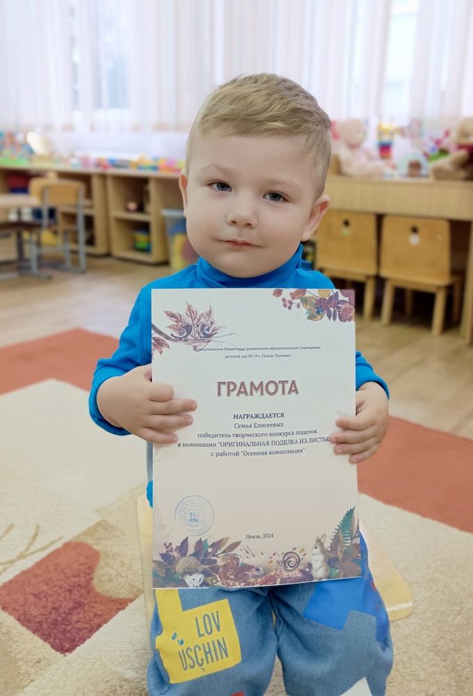 С папой собирал листья и цветы для подделки, с мамой сушил и клеил. В садике работу отметили грамотой и подарили раскраску.