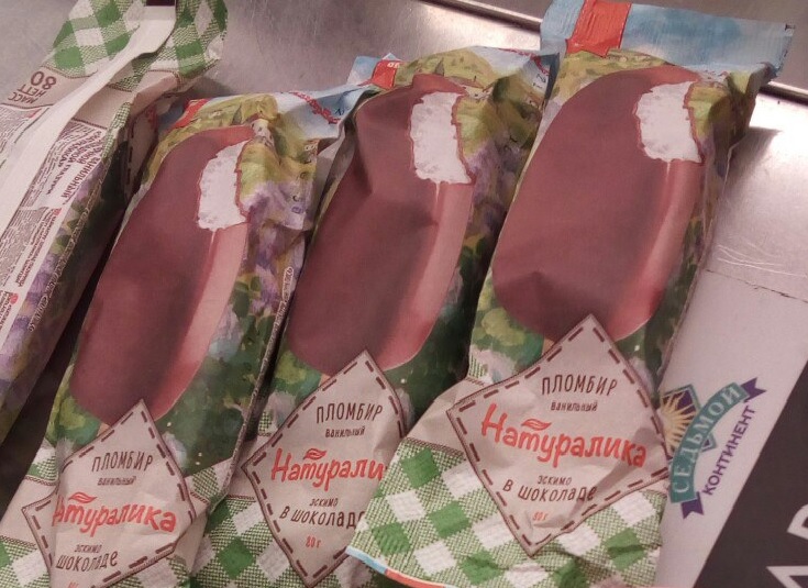 По составу понравился пломбир с ванилью(ваниль натуральная в стручках…мммм) в вафельном стаканчике «Натуралика». Само название меня привлекло, намекая на натуральность состава. Но я не особо верю надписям там, или рекламе, пока не попробую. Мне показалось даже упаковка «съедобная», по крайней мере собакен наш стащил один кулечек и сожрал половину, молоком то пахнет)), вроде нигде не застряло… Сверху стаканчик упакован в бумажную обертку, а внутри тонкое пластиковое покрытие. Сама мороженка, как бы надута изнутри, а значит не помнется. На упаковке крупно написано «БЕЗ Е». Еще есть эскимо и брикеты