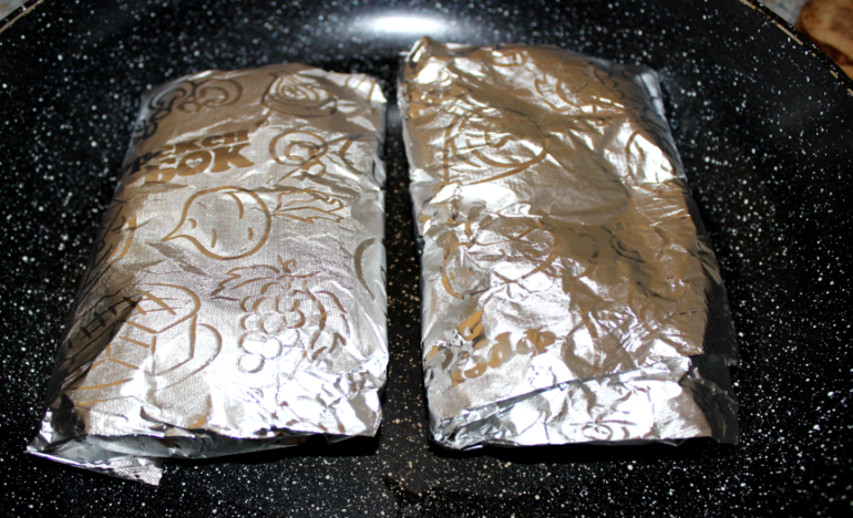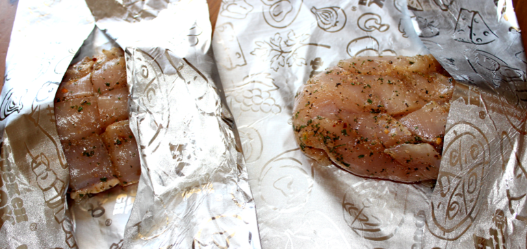 Куриные грудки вымыть и обсушить, натереть солью и свежемолотым перцем. Обжарить на разогретой сковороде в фольге (ПП рецепт).