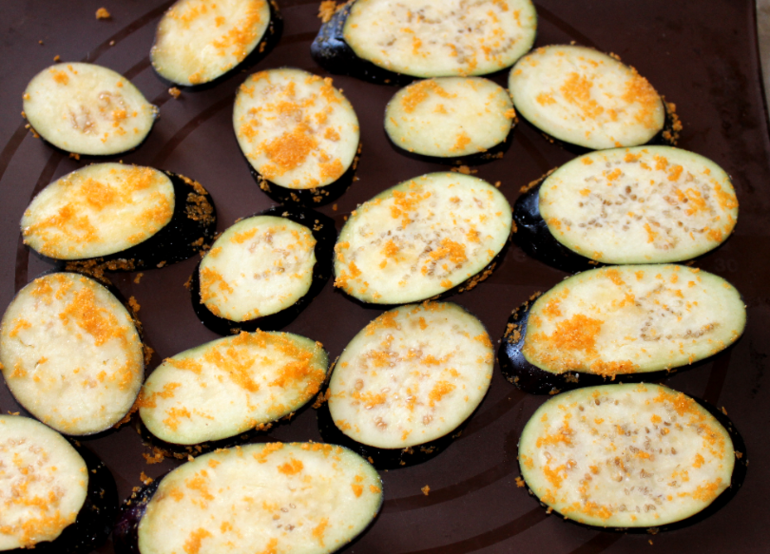 Баклажаны вымыть и нарезать кружочками. Посолить, сложить в миску залить водой и оставить на 30 минут. Затем воду слить и обсушить. Баклажаны сложить в пакет, посыпать любимыми специями, добавить 2 ст. ложки масла, я добавила из "Вяленые помидоры в МВ", 2 ст. ложки панировочных сухарей, все тчательно перемешать в пакете, и выложить на противень. Отправить в духовку до готовности. (уменьшаем калорийность)