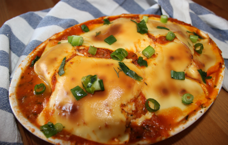 Выложить сверху мягкий сыр. Хотела сулугуни листовой, но не нашла, использовала квадратики сливочного.