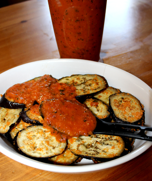 В форму для запекания уложить ломтики баклажанов. Выложить половину томатного соуса.