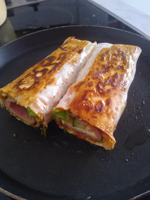 Намазываем соусом (каким нравится) - у меня тут Хреновина. накладываем что нравится... у меня: зелень рубленная (укроп, петрушка, лучок), лист салата, ветчина (колбаса), сыр, огурец.