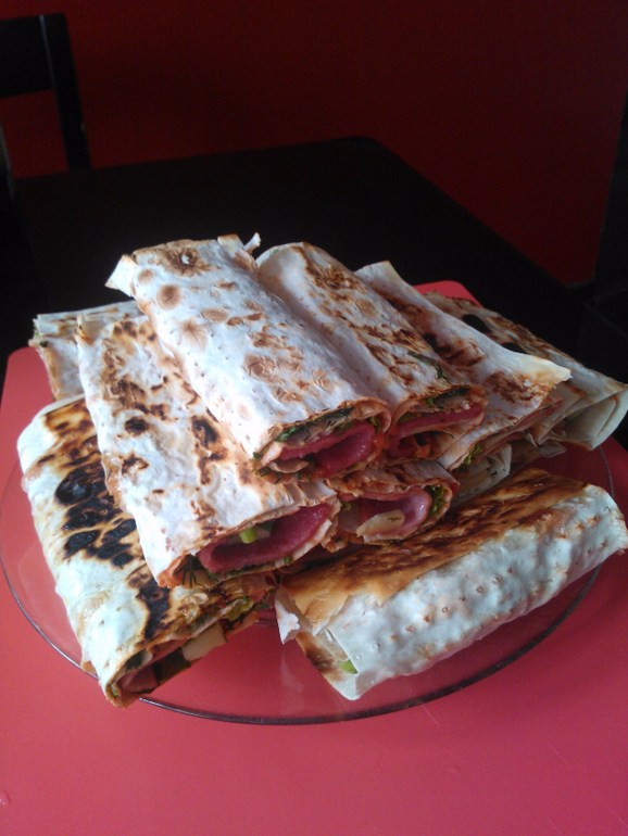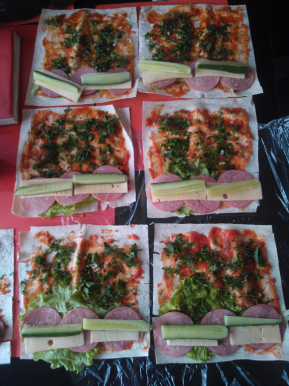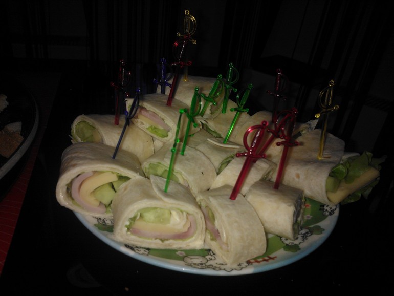 На первой фотке у меня рулеты с семгой, сливочным сыром, зеленью, огурцами и болгарским перцем. мммммм... вкусняшка! Порезано, как суши.