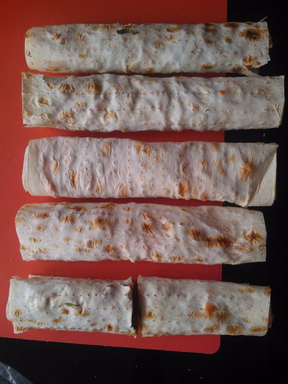 Закатываем в рулетики и режем (или не режем), кому как нравится. Я резала в данном случае пополам.