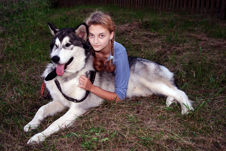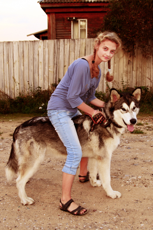 Это собак моего отца, - Тор! Порода - маламут. (помесь собаки с волком). Лаять волчара не умеет, только воет ночами. Выглядит грозно и страшно, но для охраны не годится, - залижет до смерти!