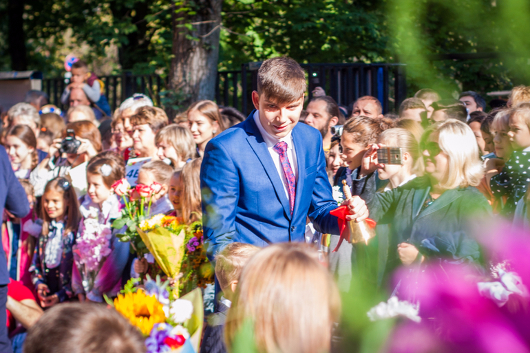 На линейке было ужасно. Мне Соню даже сфотографировать не удалось! Хотя, она в 11ом и, по-традиции, 11классники встречают первоклашек, провожают их в школу за ручку. Двор школы был хуже станции "Кузнецкий мост" в 18:30, честное слово! Некоторые висели на заборе, чтобы что-то хоть заснять. А я плохо подготовилась! Надела платье и шпильки. Хотела тоже на забор полезть, но решила прилично себя вести. Яжемать!