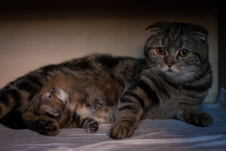 Мия своего ребенка охраняет лучше Цербера. Гоняет всех от гнезда. Кроме меня, конечно. Меня она зовет, чтобы я сидела на корачках в гнезде и гладила ее, пока наша ЯЖЕМАТЬ кормит ребенка. Причем, если начинаю гладить котенка, то мамаша бошкой своей мою руку перехватывает: "Не того гладишь! Меня гладь".