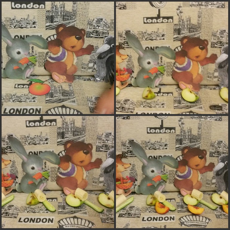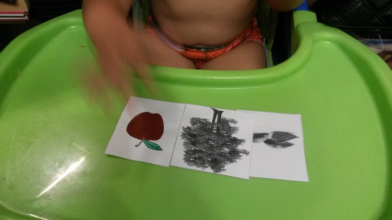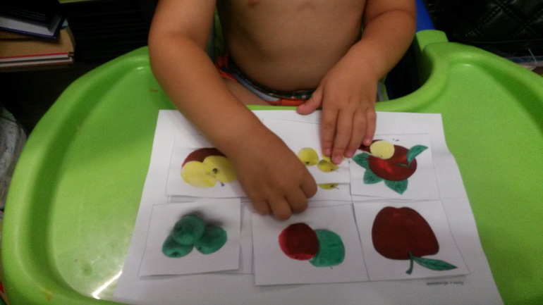 Разыграли сказку. Я пересказывала, а Тема расставлял всех героев, подбирал картинки. Затем разделили яблоко на всех.