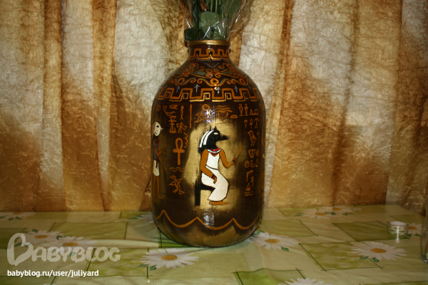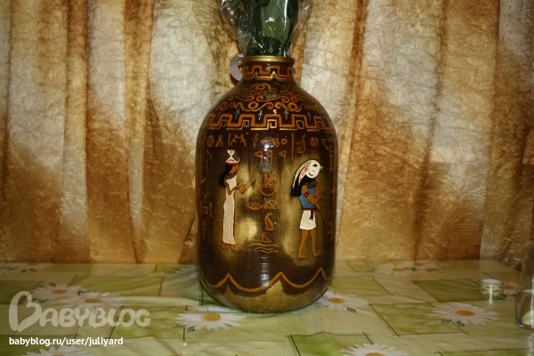 Летом наша квартира была в ремонте , комната в стиле Египта, я решила , что нужно сделать , что то своими руками , решилась на вазу . Перебрала кучу картинок , изучила иероглифы и вот , что получилось :