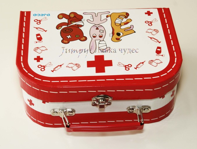 Все в детстве любили играть в Айболита. С друзьями, родителями, игрушками и даже домашними животными. Кого мы с вами только не лечили ... Сейчас времена поменялись, но ... игровые пристрастия детей остались прежними: пожарники, полицейские, дочки-матери и, конечно же, больница. Думаю, что любой ребенок взяв в руки чемодан настоящего Айболита, будет просто в восторге от его наполнения: пластыри на резинках, бинт, шпатель, тюбик мази, салфетка, шприц, градусник, стетоскоп, медицинская карточка, рецепты, салфетка. С такими сокровищами любая игрушечная болезнь не страшна!