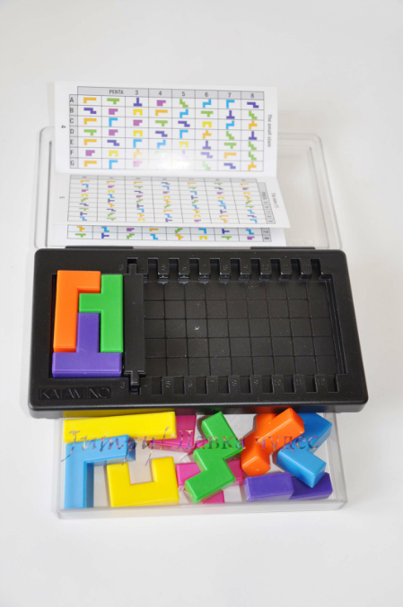 В комплекте: 12 пентамино из высококачественного пластика, 1 игровое поле с ящичком для неиспользуемых фигурок, 1 барьер для ограждения игрового поля, книжечка с заданиями.