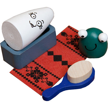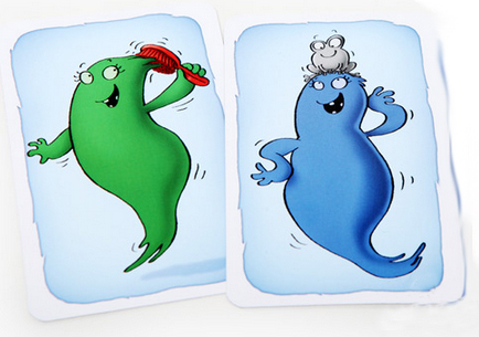У вас в руках оказались фотокарточки, сделанные каким-то странным фотоаппаратом: фотографируя всего пять предметов пяти разных цветов он постоянно путает их цвета. Зелёная бутылка становится красной, красное кресло – белым, а серая мышь – синей! Задача игроков быстро определить по карточкам признаки какого предмета там отсутствуют или, наоборот, какой предмет получился абсолютно таким же, как в реальности. По очереди открывается каждая карточка и игроки должны схватить предмет, изображённый на карте, но при этом обязательно должен совпадать цвет! Если же таких вариантов не оказалось, то тут начинается самое интересное! Игроки должны хватать тот предмет, которого нет на карточке и цвета, который на ней тоже отсутствует! Например, вы вытянули карточку, где изображён синий барабашка с зелёной мышью. Эти цвета не совпадают с реальными, значит вам необходимо хватать НЕ барабашку, НЕ мышь, НЕ синее, Не зелёное! Остаётся красное кресло! Самый сообразительный и ловкий игрок забирает карточку себе (по количеству набранных карточек определяется победитель). Схватив предмет по ошибке, вы лишаетесь одной из своих карточек.