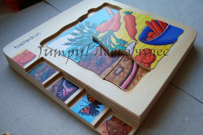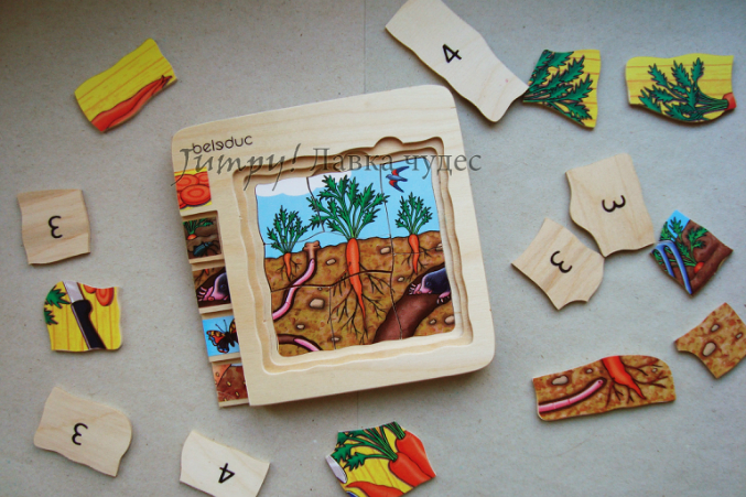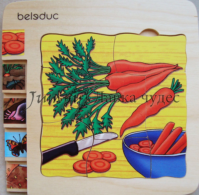 С помощью этих пазлов дети узнают как растет морковь. Каждый пазл в этой серии – целая история. Задача ребенка – собрать не только части каждого пазла, но и сложить слоями все пазлы в правильной последовательности.