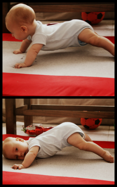 Пытается ползти уже вовсю. Не удержать! Оставляю в одном месте, нахожу в другом. Ни на секунду теперь не оставить. Вчера оставила на матрасике на минуту, пришла а Джона и след простыл. Нашла его под журнальным столиком. :) Лежать уже не нравится, хочется всё куда-то туда, где повыше и поинтереснее. Много времени проводит теперь у меня сидя на коленях. Растем в общем. :)