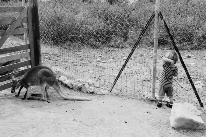 Размышляющий Бенджи. Как бы перелезть?? И таки перелез, пока папа не видел. Разогнал всех кенгуру, собрал вокруг себя весь персонал. Потом и папа за ним перелез. Вообщем было весело)